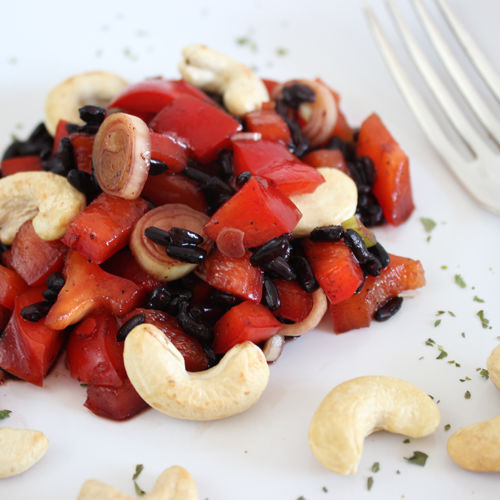 Ich habe ein Rezept gesucht, das einfach geht, für viele Personen machbar ist und das sowohl geschmacklich als auch optisch überzeugt. Also habe ich Reissalat gemacht. Aus schwarzem Reis, Paprika, Cashews, Frühlingszwiebeln und einem asiatischen Dressing aus Limettensaft und Sambal Oelek. Und was soll ich sagen? So schnöde sich Reissalat auch anhört, so überraschend ist er auf dem Teller! Und auf der Gabel! Und im Mund! Einfach traumhaft! Und das Beste? Dieser Salat ist eigentlich ein Allround-Verträglichkeits-Wunder! Der Reissalat enthält keinen Weizen, keine Laktose, kein Gluten, keine Produkte tierischen Ursprungs – also sogar Veganer-geeignet. Der Reissalat schmeckt aber auch Nicht-Veganern hervorragend!:)