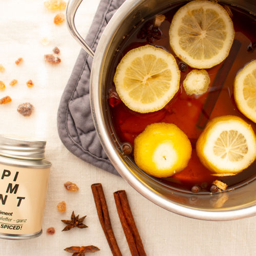 - Zitrone, Ingwer, Zimt und Piment in den Topf geben und auf niedriger Temperatur langsam erhitzen.